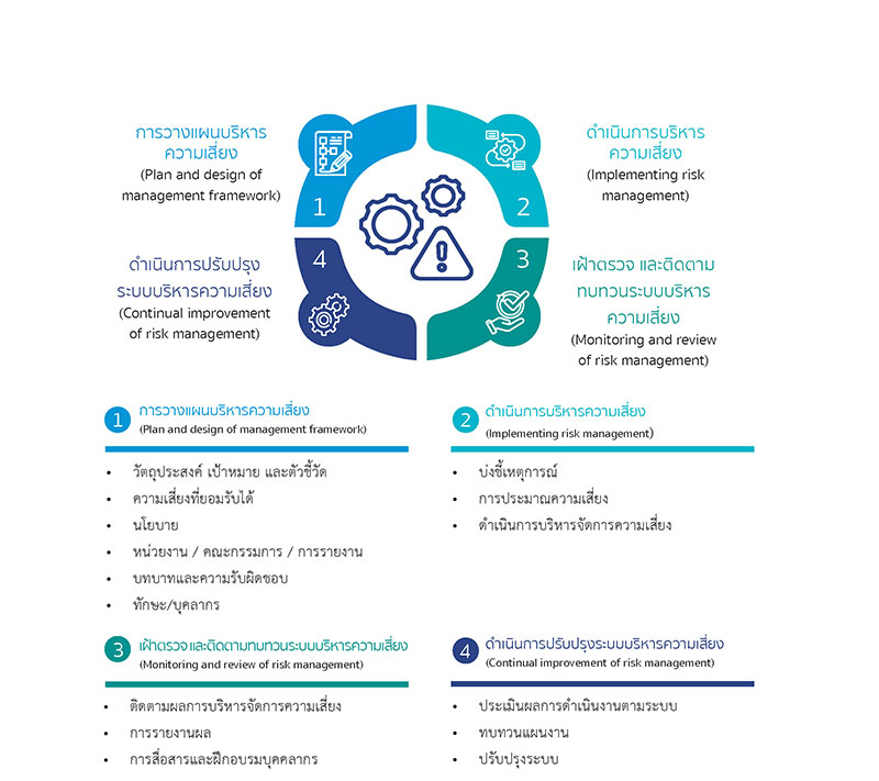 เพื่อให้การบริหารความเสี่ยงของบริษัทในกลุ่มสมบูรณ์ เป็นไปอย่างมีประสิทธิผล จึงได้กำหนดกรอบการบริหาความเสี่ยง ประกอบด้วย 4 ขั้น ตอนหลัก ได้แก่ 1) การวางแผนบริหารความเสี่ยง (Plan and design of management framework ) 2) ดำเนินการบริหารความเสี่ยง (Implementing risk management) 3) เฝ้าตรวจ และติดตามทบทวนระบบบริหารความเสี่ยง (Monitoring and review of risk management) และ4) ดำเนินการปรับปรุงระบบบริหารความเสี่ยง (Continual improvement of risk management) โดยบริษัทฯ กำหนดผู้รับผิดชอบในการประเมินความเสี่ยง กำหนดแผนและมาตรการบริหารจัดการความเสี่ยงให้อยู่ในระดับที่ยอมรับได้ ตลอดจนติดตามและรายงานผลการบริหารความเสี่ยงอย่างต่อเนื่องในทุกระดับ ตั้งแต่ระดับองค์กร กลุ่มธุรกิจ และสายงานหน่วยงาน